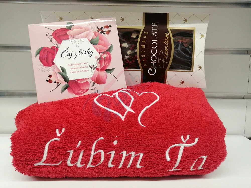 Darčekový set Ľúbim ťa obsahuje: vyšívanú osušku, ovocný sypaný čaj a exkluzívnu čokoládu.