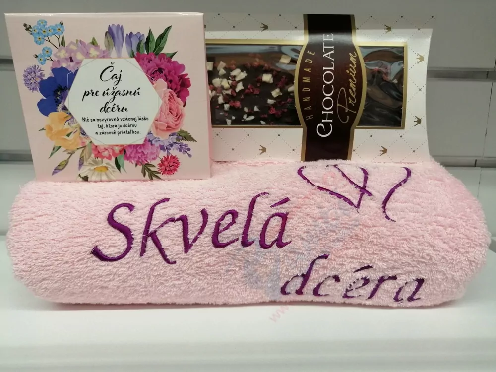 Darčekový set Skvelá dcéra obsahuje: vyšívanú osušku, ovocný sypaný čaj a exkluzívnu čokoládu.