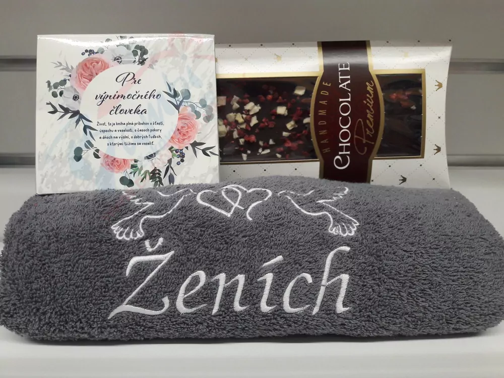 Darčekový set Ženích obsahuje: vyšívanú osušku, ovocný sypaný čaj a exkluzívnu čokoládu.