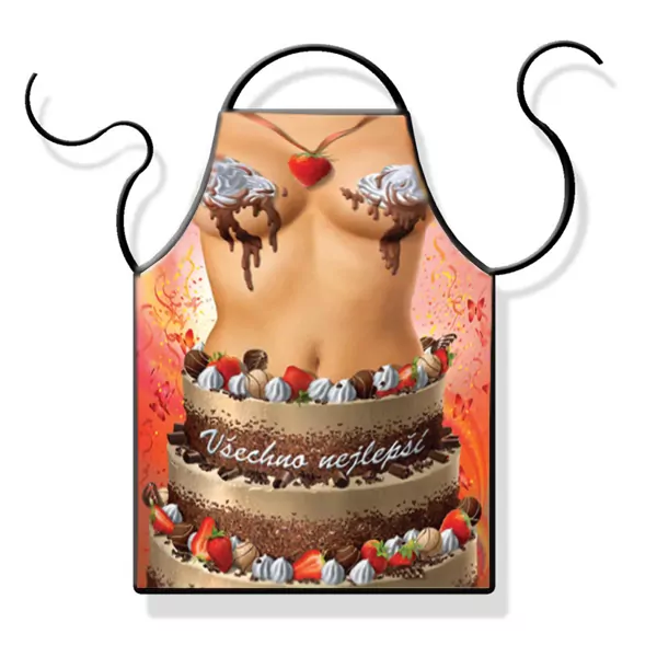 Kuchyňská humorná zástera Torta s erotickým nádychom. Neoceniteľná pomôcka v kuchyni, na grilovačke, párty atď. Tento darček určite poteší a zároveň pobavý každého milovníka varenia. Materiál 100% polyester s vysokým rozlíšením a kvalitnou potlačou. Prať v práčke do teploty 50°C. Rozmery zástery: dĺžka 73 cm, šírka 57 cm.