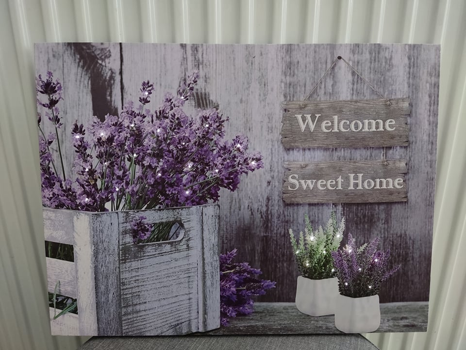 Krásny dekoračný kúsok obraz s levanduľovým motívom a textom Welcome sweet home je darček, ktorý určite vynikne v každej domácnosti. Potešte oslávenca týmto kúskom a doprajte mu nezabudnuteľné chvíle večernej pohody, pretože levanduľa na obraze svieti pomocou LED svetielok