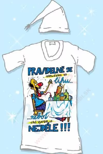 Originálna nočná košeľa bielej farby s nápisom: Pravidelne se nakládám do lihu...neboť chci vzdržet co nejdéle!!! Ku košeli je aj rovnako farebne zladená čiapka pre maximálne pohodlie počas spánku. Skvelý praktický darček na každú príležitosť, ktorému sa iste poteší každý obdarovaný.