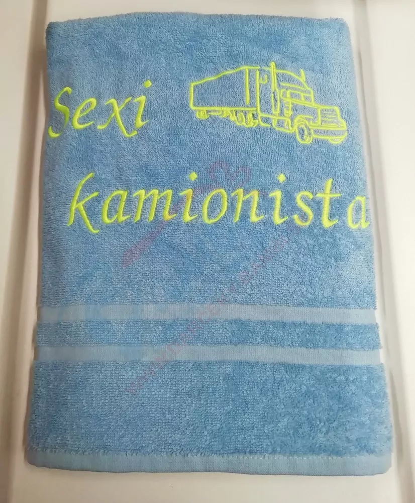 Osuška s vyšitým motívom Sexi kamionista je vyrobená z bavlny. Je veľmi mäkká a vysoko savá z príjemne mäkkého materiálu. K farbeniu boli použité farbivá najlepšej kvality, ktoré zabezpečujú trvalosť farby hoci aj po viacerých praniach. Materiál: 100 % bavlna; Rozmer: 140cm x 70cm; Gramáž: 400g/m2