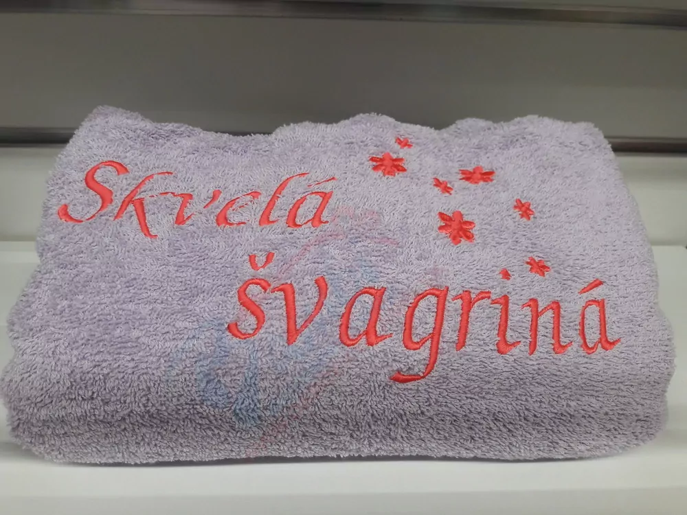 Osuška s vyšitým motívom Skvelá švagriná je vyrobená z bavlny. Je veľmi mäkká a vysoko savá z príjemne mäkkého materiálu. K farbeniu boli použité farbivá najlepšej kvality, ktoré zabezpečujú trvalosť farby hoci aj po viacerých praniach. Materiál: 100 % bavlna; Rozmer: 140cm x 70cm; Gramáž: 400g/m2