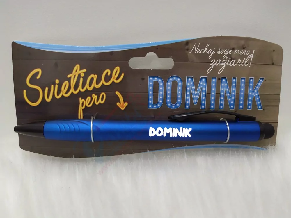 Štýlové svietiace darčekové pero s menom Dominik je vďačným a zaujímavým darčekom, ktorým urobíte radosť každému na akúkoľvek príležitosť.Elegantné pero so stylusom bude skvelým pomocníkom pre každého vlastníka telefónu či tabletu. Z jednej strany s ním môžete písať na papier, robiť si poznámky do diára a z druhej ovládať svoj telefón, alebo tablet. Pero naviac zdobí krásny nápis, znamenie alebo jedno z populárnych mien, ktoré sa po zapnutí pera krásne rozsvietia.