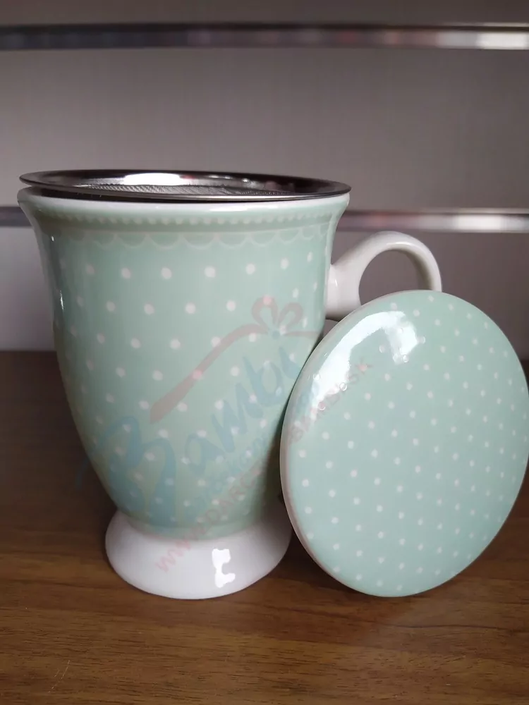 Nádherný set zelený na sypaný čajík pozostáva zo šálky, sitka a pokrievky. Sitko je veľmi kvalitné a husté, bylinky sa vylúhujú, sitko jednoducho a pohodlne vytiahnete a môžete si vychutnávať čajík bez zbytočných ,,smietok,,.
