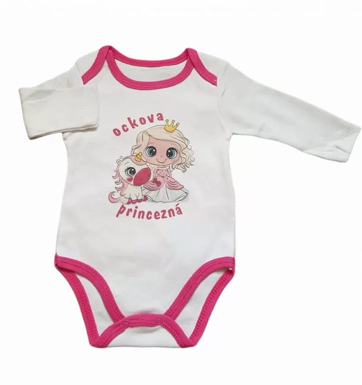 Detské body, vyrobené z jemnulinkej, kvalitnej bavlny s nápisom Ockova princezná a s obrázkom krásnej princeznej, ktorej nemôže chýbať jednorožec, budú milou drobnosťou - ako darček pri príležitosti narodenia, či pri návšteve už väčšieho bábätka alebo ako darček pre tehotnú maminku.