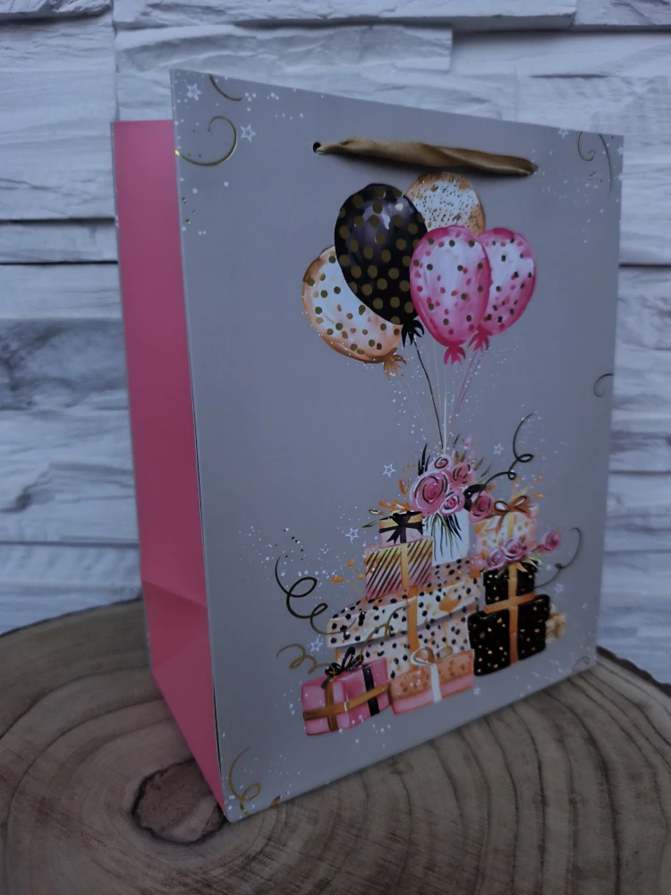 Veselá darčeková taška s motívom darčekov a balónikov je ideálna na oslavy, narodeniny či iné radostné príležitosti. Hravý dizajn okamžite navodí slávnostnú atmosféru a spraví z každého darčeka ešte väčšie prekvapenie.