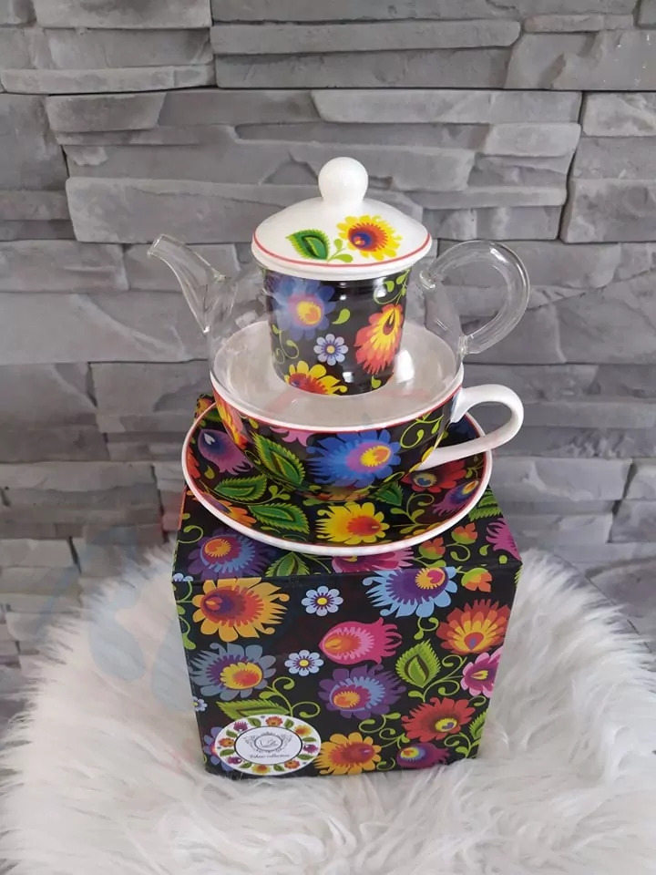 Set na sypaný čajík v čiernom prevedení s farebnými kvietkami v darčekovej krabičke. Set obsahuje sklenený čajník so sitkom z porcelánu, šálku a podšálku v rovnakom motíve. Po vybalení setu Vám darčeková krabička môže poslúžiť na rôzne drobnosti. Skvelý darček na každú príležitosť pre všetky milovníčky kvalitného čaju.