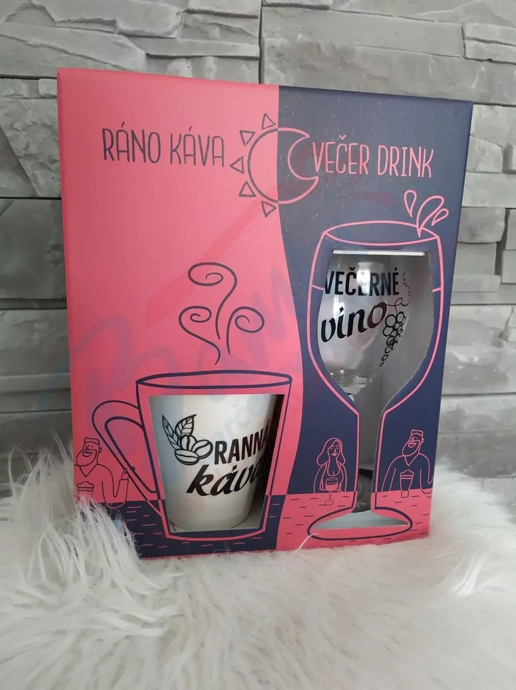 Darčekový set pre vínkarku obsahuje šálku s nápisom:Ranná káva a pohár s nápisom: Večerné víno.