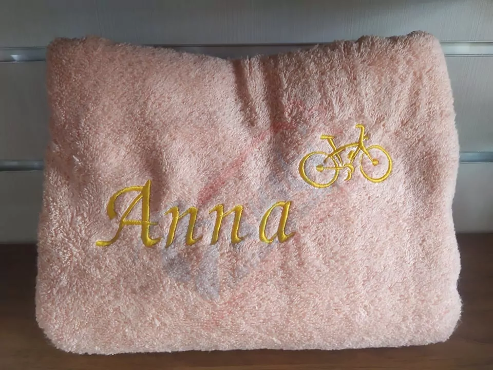 Osuška s vyšitým motívom Anna s obrázkom bicykla, je vyrobená z bavlny. Je veľmi mäkká a vysoko savá z príjemne mäkkého materiálu. K farbeniu boli použité farbivá najlepšej kvality, ktoré zabezpečujú trvalosť farby hoci aj po viacerých praniach.
