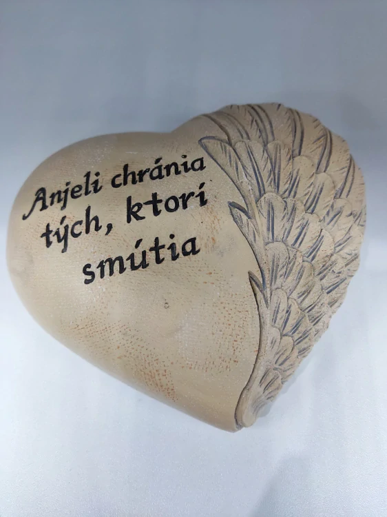 Dekorácia sdce so vzorom anjelského krídla, na ktorom je nápis "Anjeli chránia tých, ktorí smútia" je krásna dekorácia na hrob. Je vhodný ku sviatku všetkých svätých a pomocou neho si vieme uctiť pamiatku všetkých zosnulých. Anjel, srdcea a kríž sú najkrajšie symboly nebeskej ochrany. Soška je bledohnedej farby.