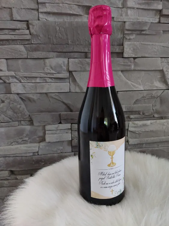Detské šampanské ako darček pre prvoprijímajúce dieťatko. Na etikete sa nachádza text: Milosť dnes mi bola daná, prijať Sväté telo Pána. Nech mi v srdci stále býva a s ním moja viera živá.