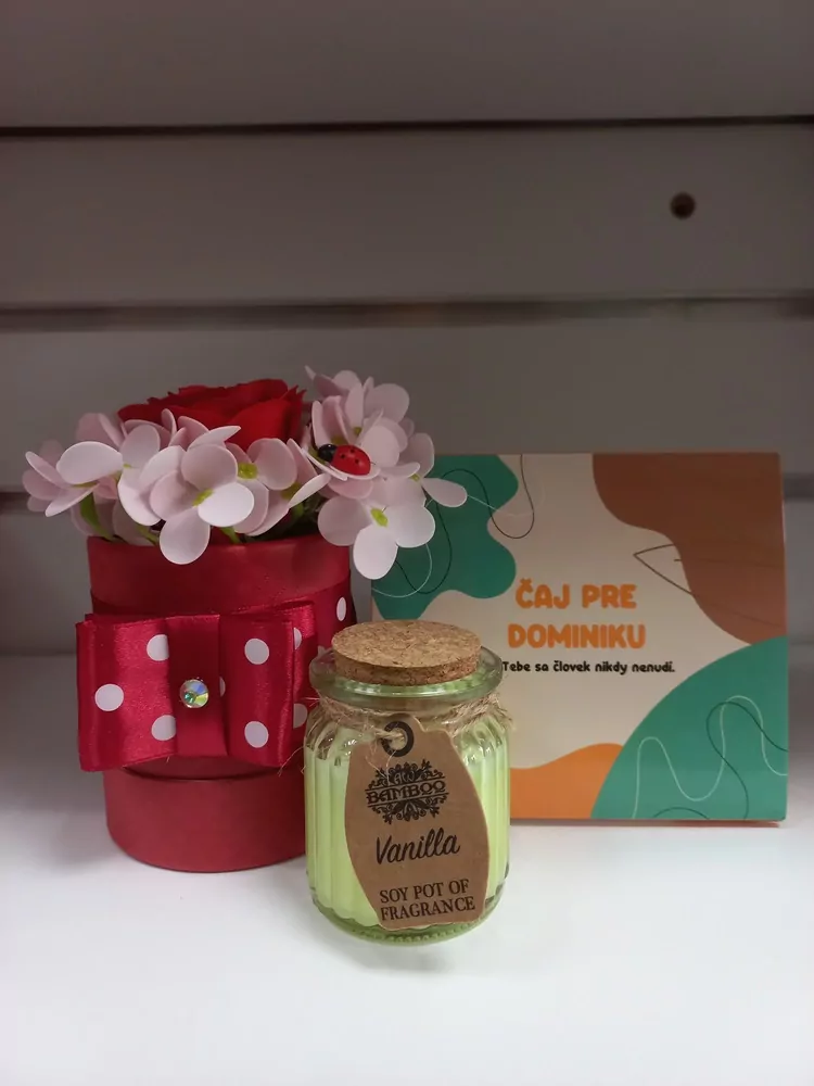 Potrebujete darček, ktorý vyzerá pekne a zároveň má praktické využitie? Potešte krásnou darčekovou sadou, ktorá urobí šťastným kohokoľvek. Táto sada tvorí box plný mydlových kvetov, krásne voňavú sviečku a sypaný ovocný čaj s krásnym citátom na zlepšenie dňa.