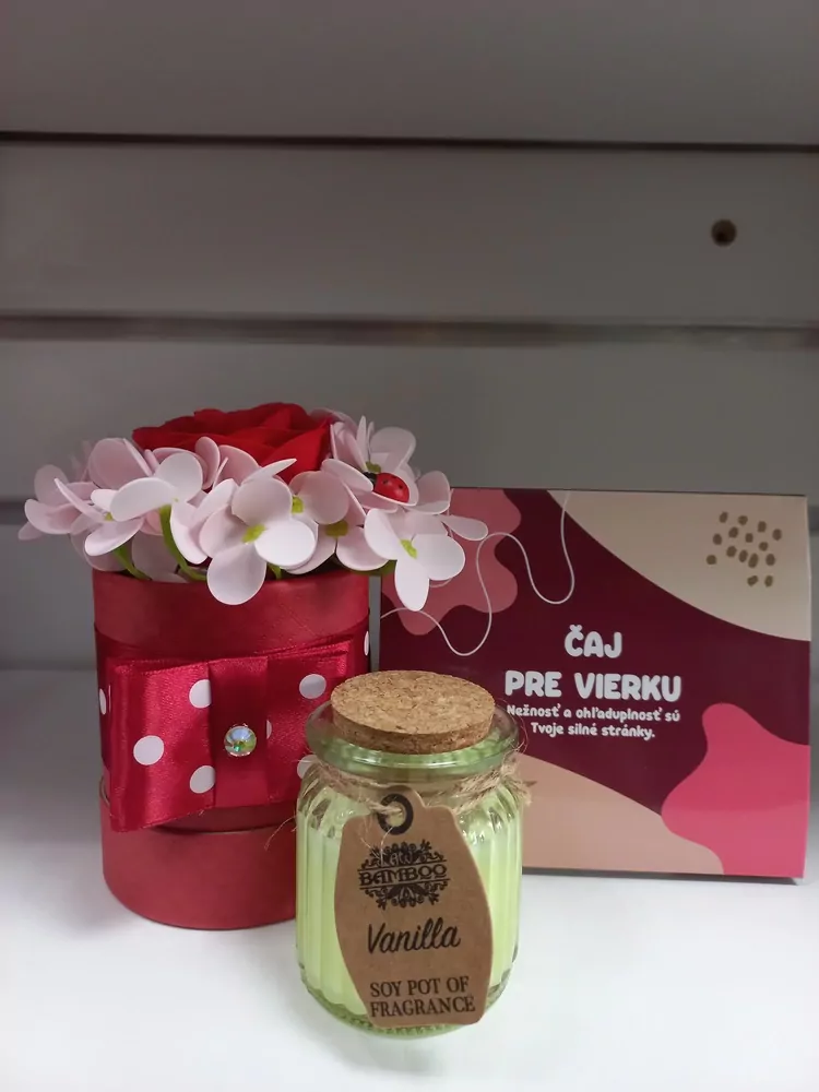Potrebujete darček, ktorý vyzerá pekne a zároveň má praktické využitie? Potešte krásnou darčekovou sadou, ktorá urobí šťastným kohokoľvek. Táto sada tvorí box plný mydlových kvetov, krásne voňavú sviečku a sypaný ovocný čaj s krásnym citátom na zlepšenie dňa.
