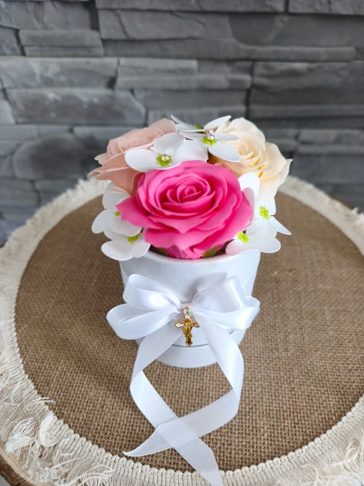 Elegantný biely box s mydlovými kvetmi je krásnym a trvácnym darčekom k výnimočnej udalosti, akou je prvé sväté prijímanie. Jemné kvety vyrobené z mydla pôsobia ako živé a zároveň si zachovávajú svoj tvar aj farbu po dlhý čas.