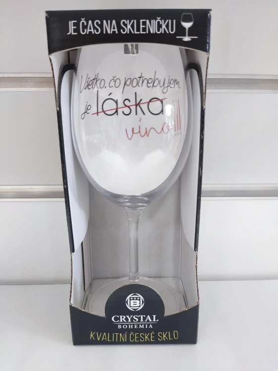 Doprajte si skvelé víno s pohárom "Všetko, čo potrebujem je -láska- víno!!!". Dobré víno je skvelým spoločníkom či už na narodeninovú oslavu, párty alebo len na relaxáciu po dlhom dni . Vychutnajte si ho s trochou humoru v pohári na víno.