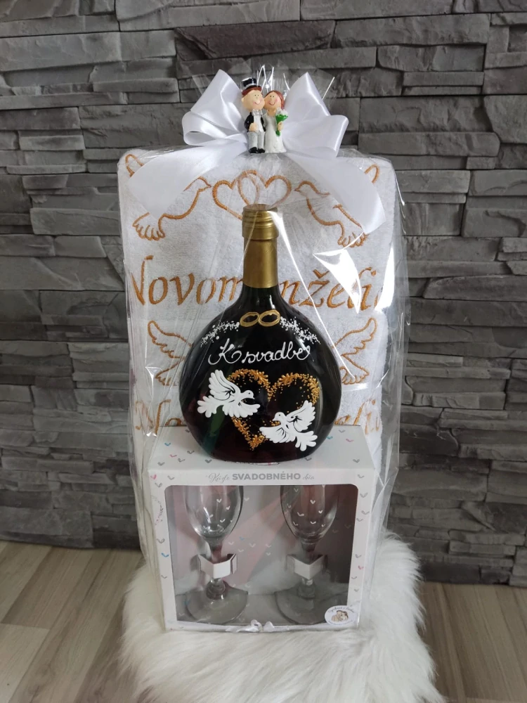 Celý balíček je krásne naaranžovaný, ozdobený veľkou bielou mašľou a figúrkou veselého ženícha s nevestou - stačí len darovať!