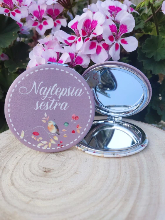 Luxusné kozmetické zrkadielko z brúsenej ocele, zdobené koženkou a nápisom Najlepšia sestra. Jedno spätné a jedno zväčšovacie zrkadlo vo vnútri zaistí dokonalý komfort pri každodennom použití. Vďaka jeho kompaktnej veľkosti sa dobre vojde do kabelky alebo vrecka. Praktický darček na každú príležitosť.