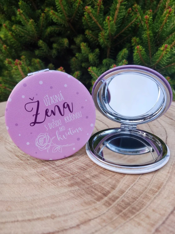 Luxusné kozmetické zrkadielko z brúsenej ocele, zdobené koženkou a nápisom Úžasná žena. Jedno spätné a jedno zväčšovacie zrkadlo vo vnútri zaistí dokonalý komfort pri každodennom použití. Vďaka jeho kompaktnej veľkosti sa dobre vojde do kabelky alebo vrecka. Praktický darček na každú príležitosť. Na zrkadielku sa nachádza nápis: ,, Úžasná žena s dušou krásnou ako kvetina...